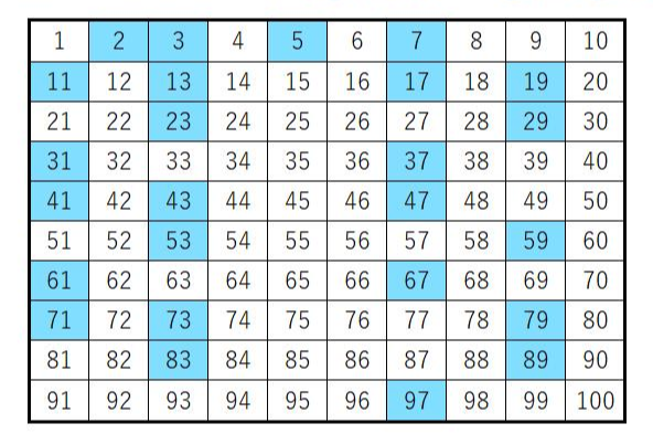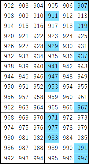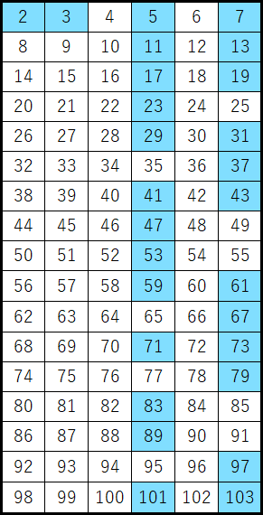이외의 소수는 반드시 오른쪽에서 1번째와 3번째 열에 출현하고 있는 것을 알 수 있습니다. 오른쪽에서번째 열이의 배수이므로6배수 전후의 숫자에 소수가 출현하는 것입니다.