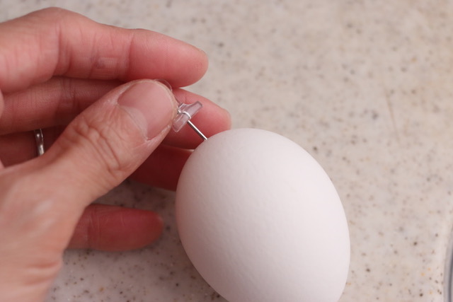 2. 냉장고에서 계란을 꺼내 달걀의 둥근 끝을 잘 씻은 핀이나 압정등으로 구멍을 뚫습니다. 여기 "공기가 고여" 있기 때문에 구멍을 뚫어서 팽창하는 공기가 잘 빠져서 달걀 껍질이 깨지는 것을 방지합니다.