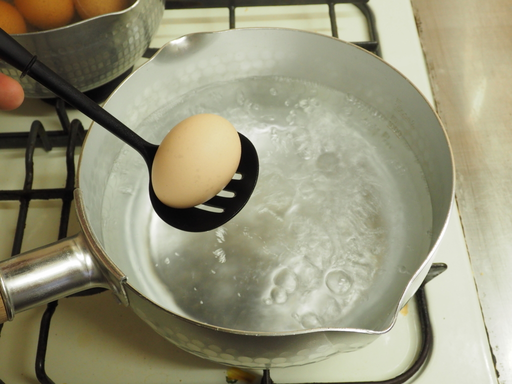 3. 끓는 물에 차가운 달걀을 넣고 있습니다. 끓는 물에 차가운 계란을 넣는 것이 포인트입니다. 찬 계란을 넣는 것으로 급격한 온도차가 생겨 껍질을 벗기기 쉬워집니다.