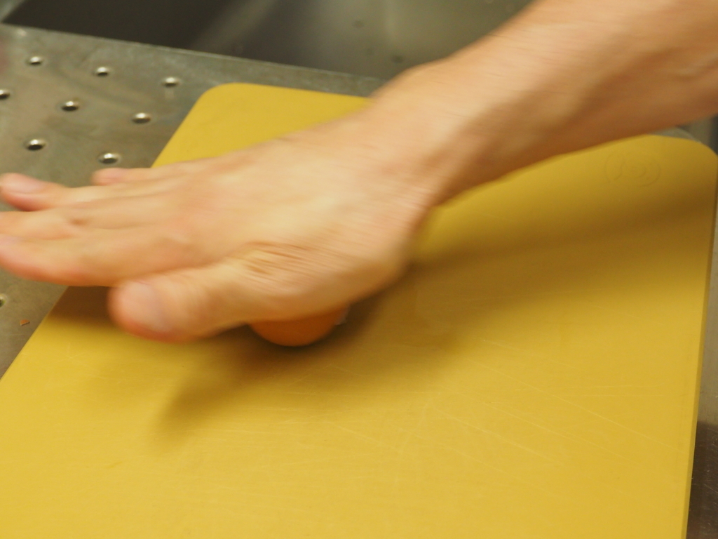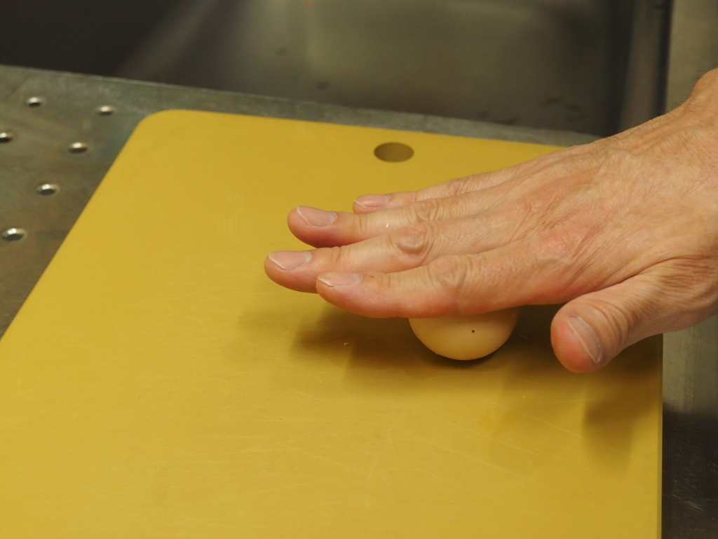1) 도마 등 평평한 곳에 삶은 달걀을 놓습니다.