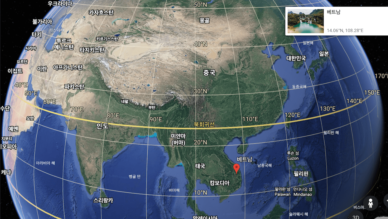 최근 많이 가는 베트남은 우리보다 25도 이상 서쪽인 110도근처에 있네요. 30도로 보면 2시간이 느리겠네요. 정답!!
