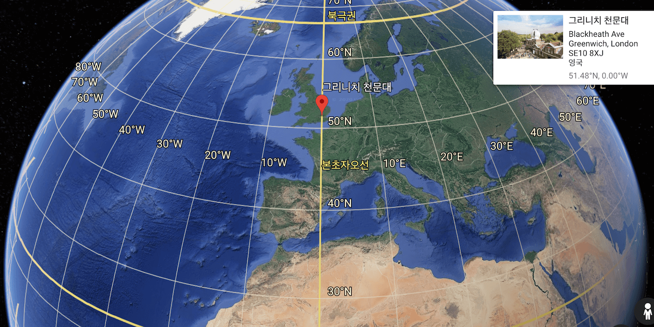 - 기준 (0도, 본초자오선) 인 영국 그리니치 천문대를 중심으로 동(동경)으로 180도 서(서경)로 180도로 부릅니다.