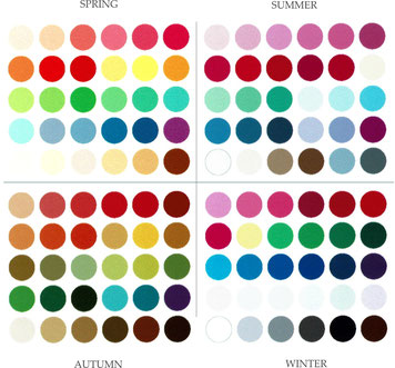 퍼스널 컬러의 4 가지 기본 유형에는 사계 (봄 여름 가을 겨울)의 이름이 붙어 있습니다. 4 가지 유형의 컬러 팔레트는 레드, 핑크, 옐로우, 그린, 블루, 퍼플, 브라운등의 색상이 있습니다.