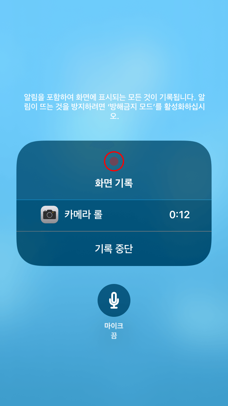 아이폰 화면 녹화할 때 간단히 자신의 소리를 넣을 수 있습니다. 방법은 녹화 버튼을 길게 눌르면 오른쪽과 같은 화면으로 전환이 됩니다. 그 화면 하단의 마이크 끔을 마이크 켬으로 바꿔주면 아이폰의 마이크를 통해 자신의 목소리를 넣을 수 있습니다.