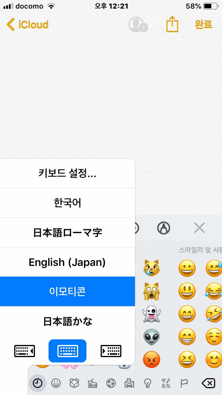 설정이 끝나고 입력을 할 때는 자측하단의 지구본 아이콘을 길게 눌러서 나온 항목중에 이모티콘을 선택합니다. 키보드가 이모티콘으로 바뀌면, 원하는 이모티콘을 찾아서 넣어 주면 됩니다.