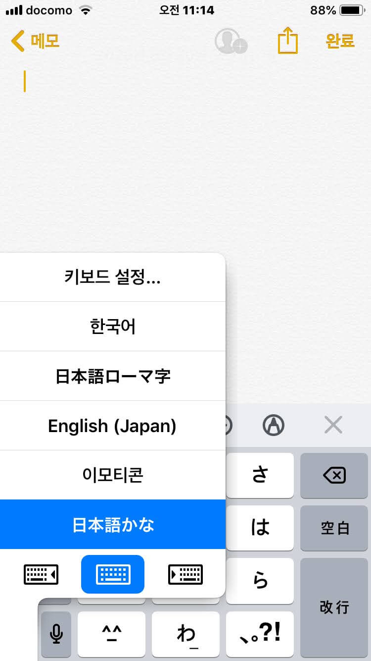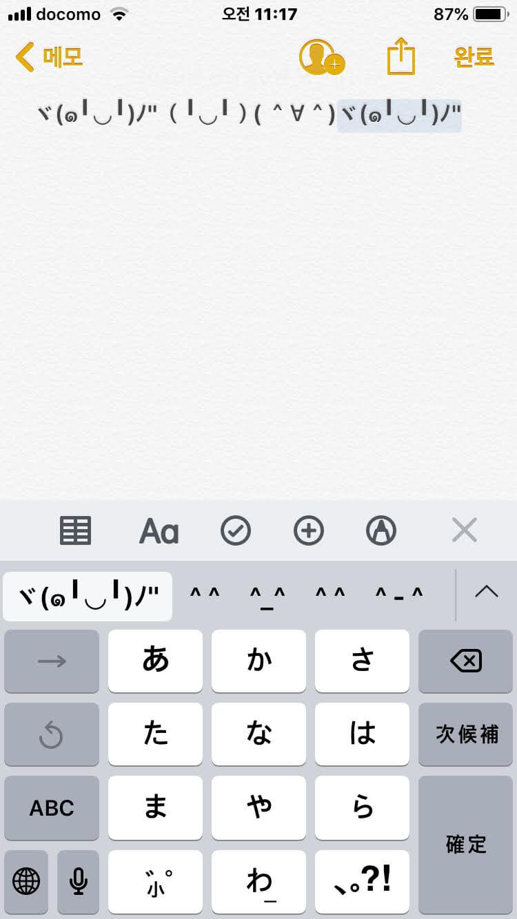 Kana키보드 추가가 끝나고 사용하기 위해서, 좌측 하단의 지구 모양 아이콘을 길게 누르면 나오는 항목중에 日本語かな 를 선택해 줍니다. 그리고 텐키 좌측 하단의 ^_^ 모양 키를 선택하고 원하는 카오모지를 쓰면 됩니다.