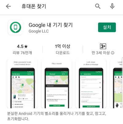 자 계정이 있으시다면, 다음은 "내 기기 찾기" 어플을 설치 합니다. Google Play 의 검색 창에 "휴대폰 찾기" "내 기기 찾기" 를 입력하면 바로 나오므로 설치합니다. (응용 프로그램은 무료).