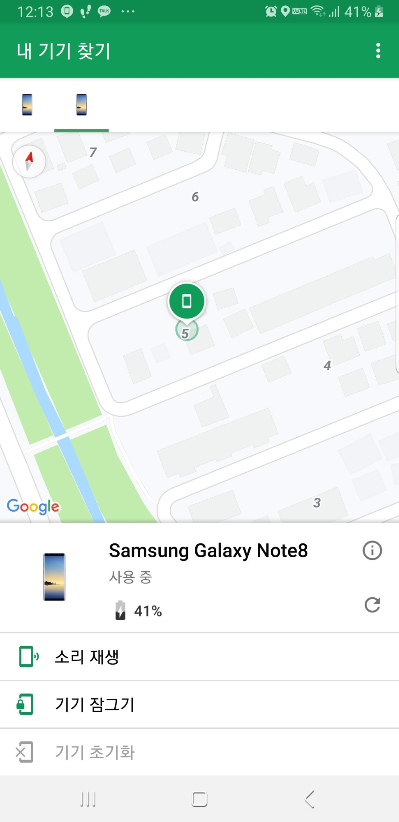 하단에 표시되는 단말 정보를 누르면 "소리 재생" "기기 잠그기" "기기 초기화" 를 할 수 있는 버튼이 나옵니다. 잠가져 있지 않다면 기기를 잠그도록 합니다. 그리고 휴대폰 근처까지 갔으면 소리 재생을 할 수 있습니다.