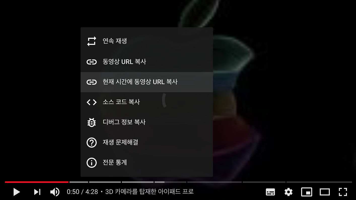 원하는 시간에 동영상을 맞추고 마우스 오른쪽 버튼을 눌러서 현재 시간에 동영상 URL복사를 선택합니다. 그러면 다음과 같은 URL이 복사되는데요.