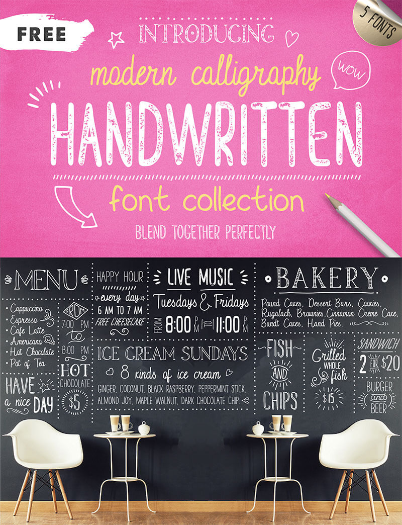 수록되어있는 5 개의 서체를 함께 사용하는 것만으로, 해외의 카페 같은 멋진 디자인을 완성 할 수있는 글꼴 컬렉션.