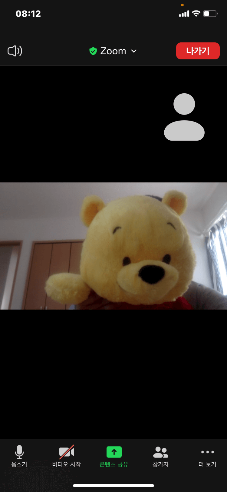 회의에서 나가고 싶을때는 '나가기' 을 탭하여 회의에서 나갈 수 있습니다. (회의 자체는 종료되지 않습니다)