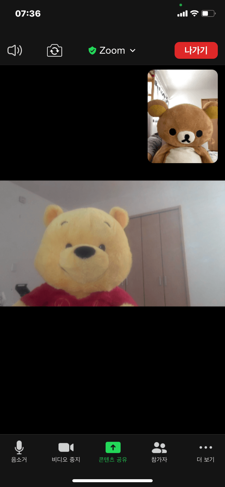 작업 방법 : 화면 우측 상단의 '나가기'를 탭한 후 확인 화면에서 "미팅을 나가기' 를 탭하면 나가기가 완료됩니다.