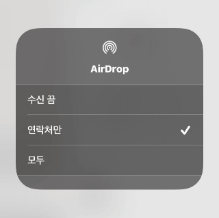 2. 처음에는 "연락처만" 이라고 설정이 돼 있는데, 에어드롭을 길게 누르면 "수신끔" "연락처만" "모두" 중 하나를 선택해 대상을 특정할 수 있습니다. 파일을 받기 위해서는 당연히 "연락처만" "모두" 중 하나를 선택합니다.