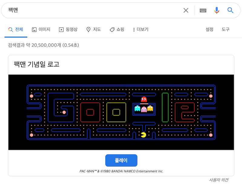 "팩맨"이라고 검색하여 위의 화면을 누르면 게임이 시작됩니다. 스마트폰에서도 상하 좌우로 스와이프하여 팩맨을 조작할 수 있습니다. 의외로 조작이 어렵습니다.