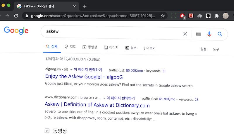 검색창에 "askew"를 입력하면 검색 화면이 카쿳과 비스듬하게됩니다.