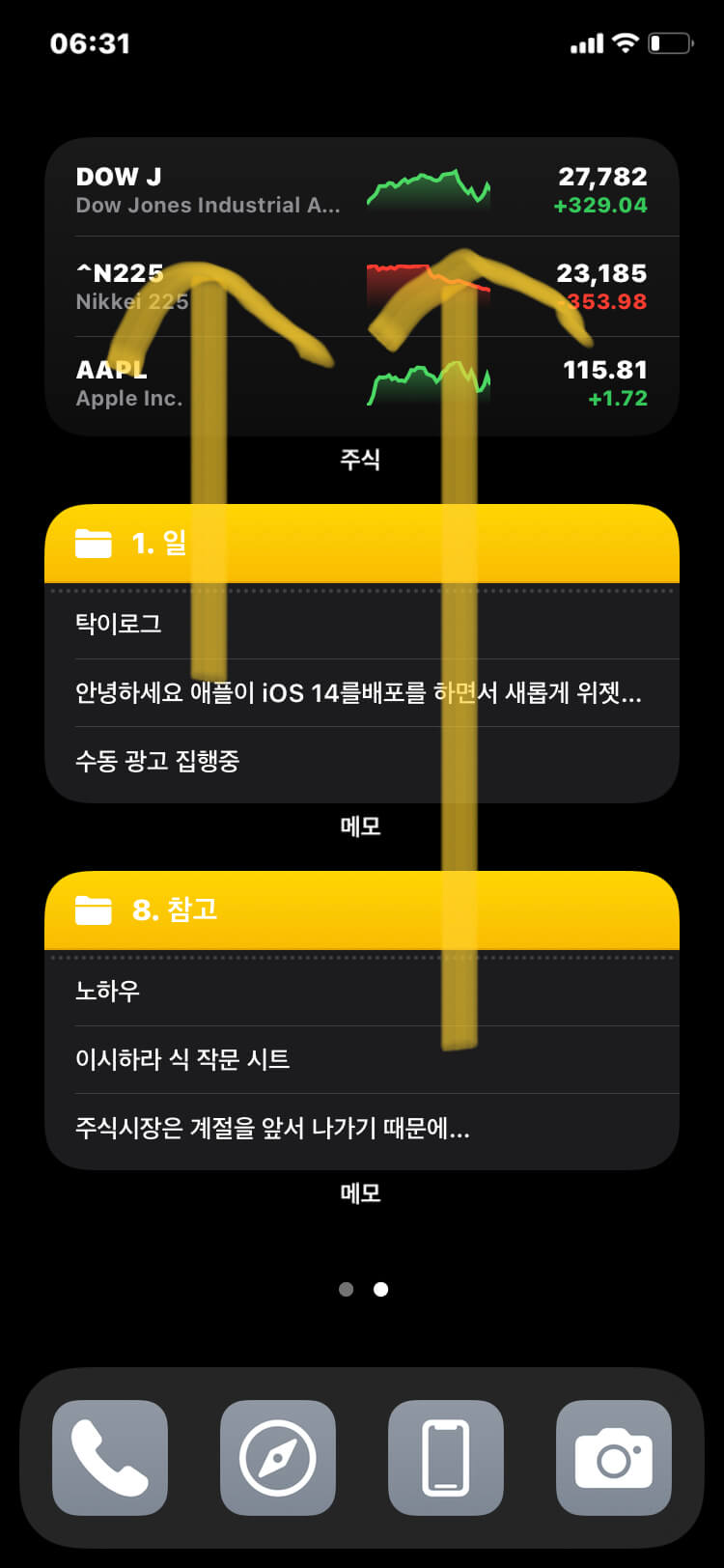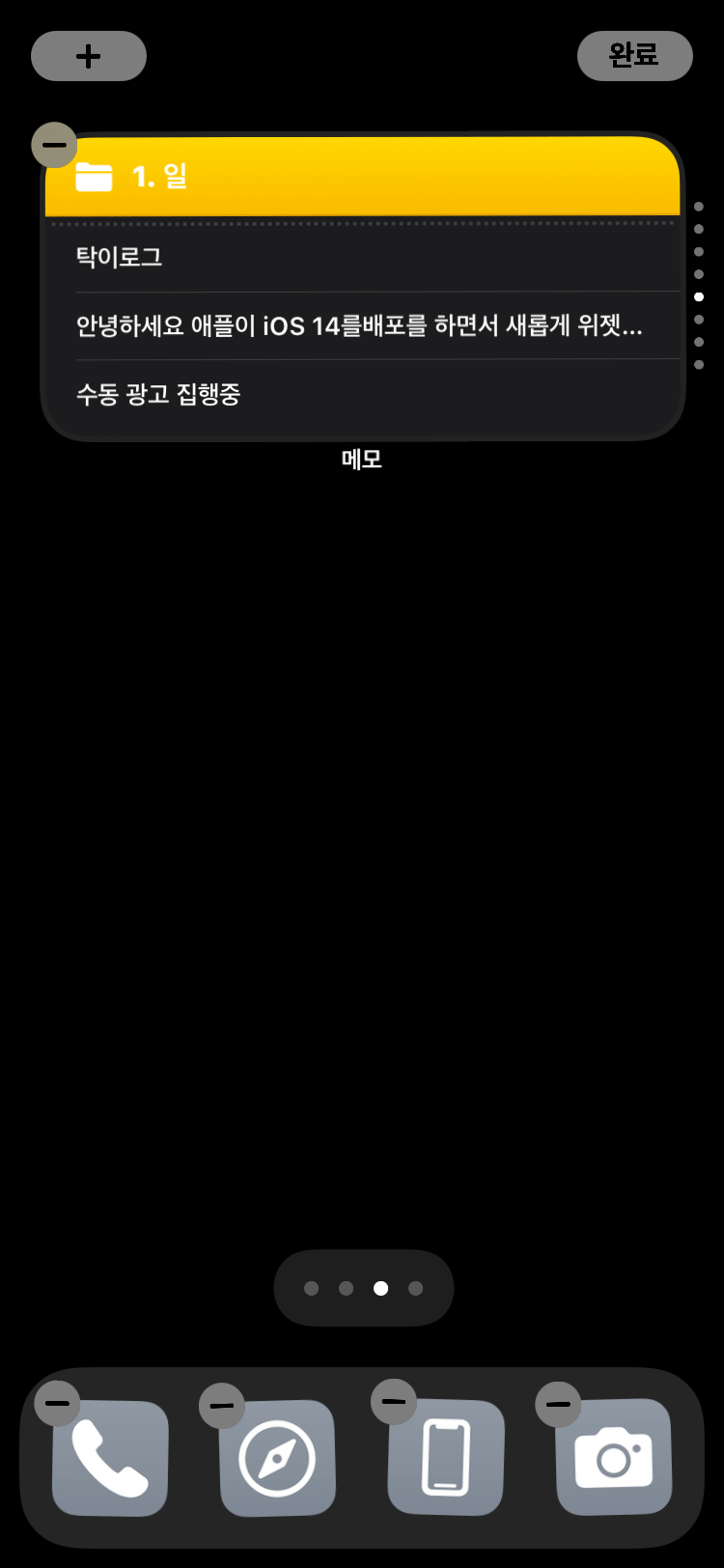 위젯은 위에서는 말한것과 같이 iOS14 이 이전 오에스와 비교해서 가장 눈에 띄는 차이점 입니다. 위젯을 추가하는 방법은 아래와 같습니다.