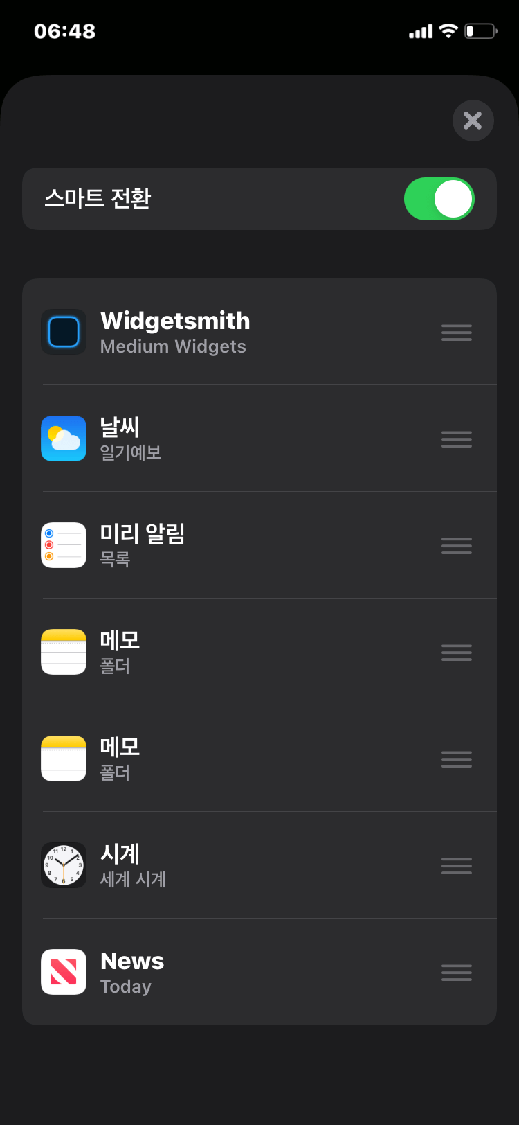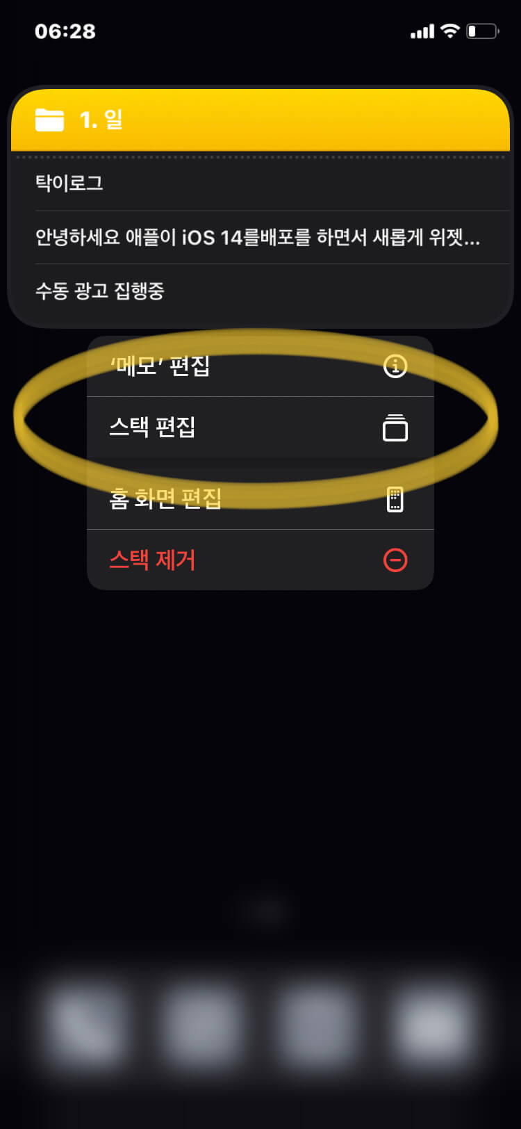 스택의 순서를 바꾸거나 삭제하고 싶은 위젯이 있을 때는 다음의 방법으로 스택을 편집할 수 있습니다.