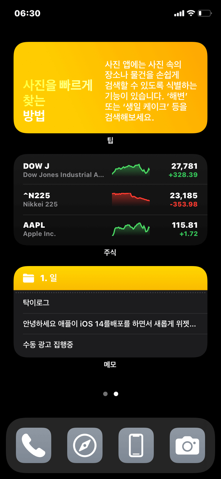 뛰어난 가시성을 자랑하지만 많은 위젯을 사용한다면 홈화면의 많은 자리를 차지하게 되는 단점이 있습니다. 그러나 위젯을 스마트스택으로 사용한다면, 이 단점을 훌륭하게 커버할 수 있기 때문에 아이폰을 아이폰답게 하는 훌륭한 신기능이라고 생각합니다.