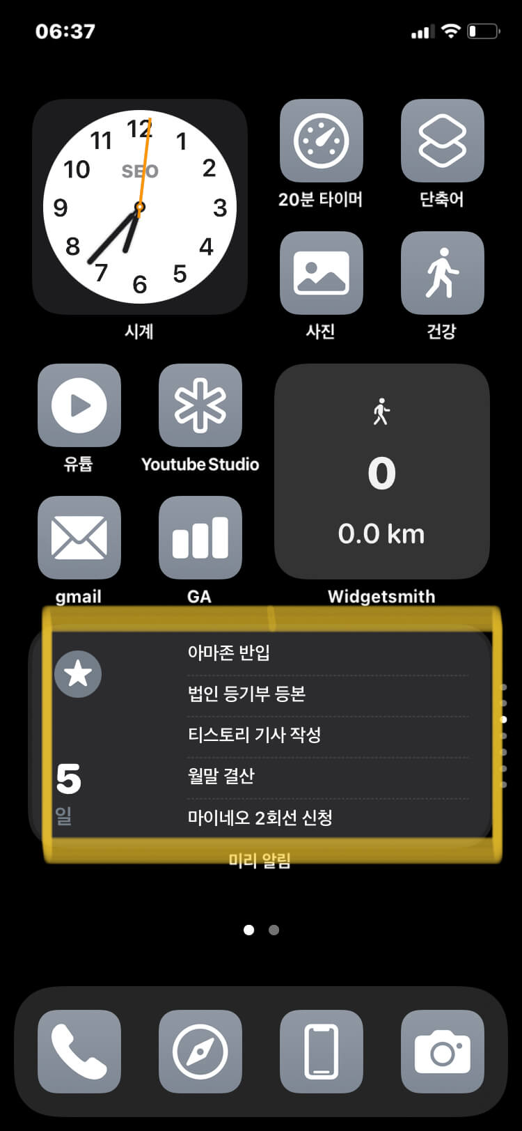 위젯은 앱을 실행하지 않고 정보를 확인할 수 있는 기능입니다. 뉴스, 미리 알림, 일정 또는 기타 아이폰에서 표시 할 수있는 정보를 한 눈에 볼 수 있도록 해주는 기능이죠. iOS14에서 홈화면에 넣을 수 있게 됐으며, 가장장작은 크기가 아이콘 4개의 자리를 차지하게 됩니다. (가장 큰 사이즈는 16개)