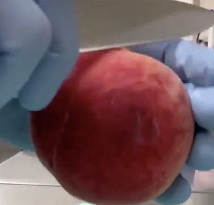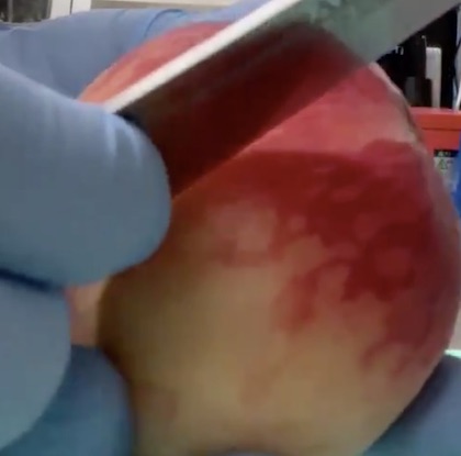 洗った桃を、包丁の背の部分で、全体に軽く撫でたら、皮だけ切る形で、切れ目を1本入れて、切れ目を左右に開くと、つるんと剥けるよ pic.twitter.com/rmzxkTaezT