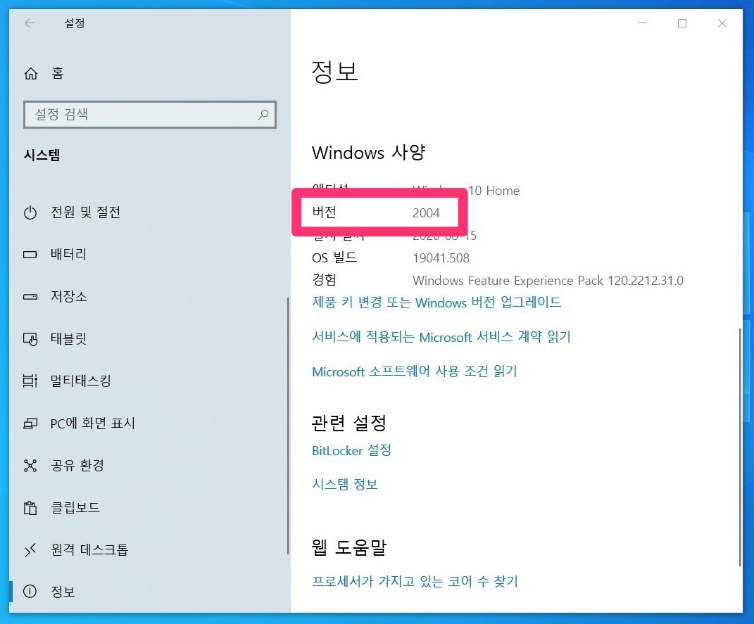 - "버전" 에서 사용중인 Windows 10 업데이트 버전을 확인할 수 있습니다. "OS 빌드"는 이용하고 있는 업데이트의 버전을 의미합니다.
