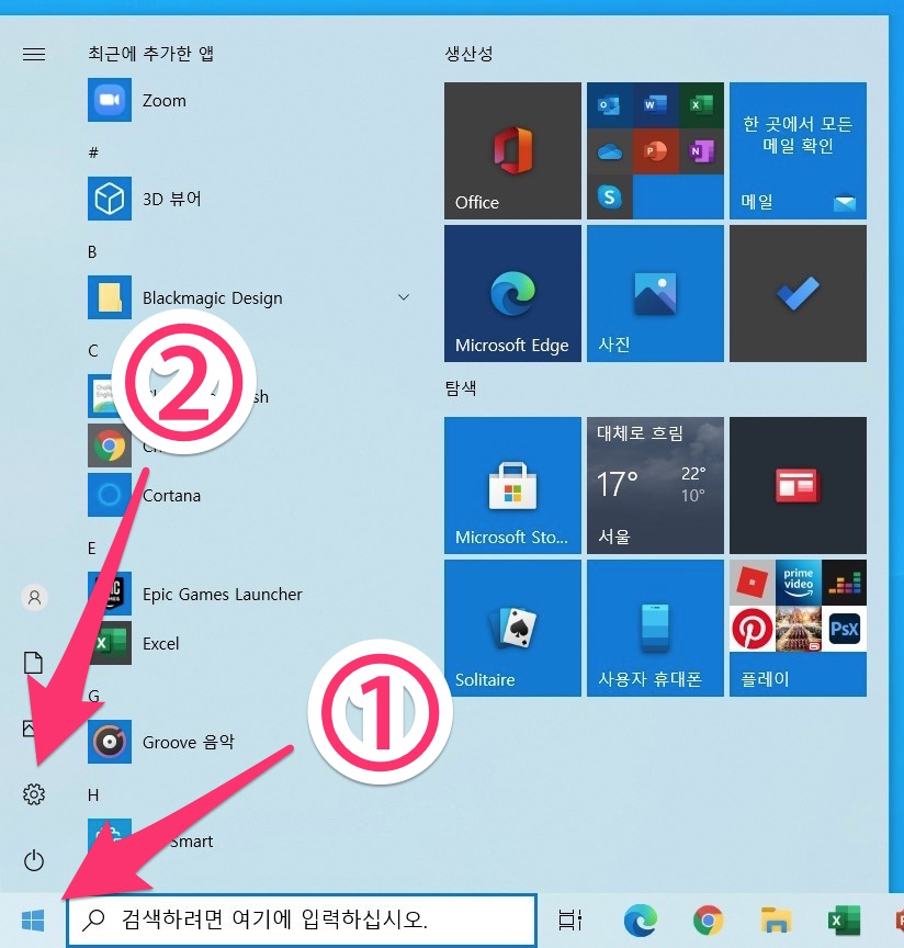 - 우선 Windows 버튼을 눌러 기어 마크의 "설정"을 선택합니다.