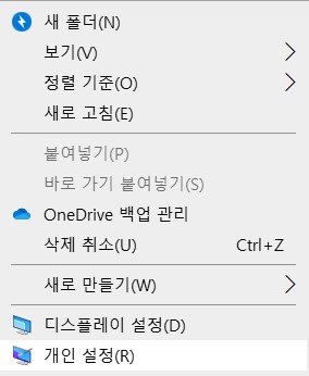 바탕 화면의 아무곳에서나 마우스의 "오른쪽 클릭"을 하여 메뉴를 표시합니다. 표시된 팝업 메뉴에서 "개인 설정"을 선택합니다.