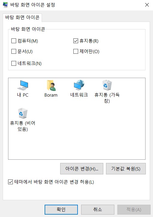 바탕 화면 아이콘 설정 창이 나타납니다. 바탕 화면 아이콘에서 표시 할 기능에 체크합시다. 제 경우에는 컴퓨터와 제어판 그리고 휴지통을 체크했습니다. 끝나면 "확인" 을 눌러 줍니다.