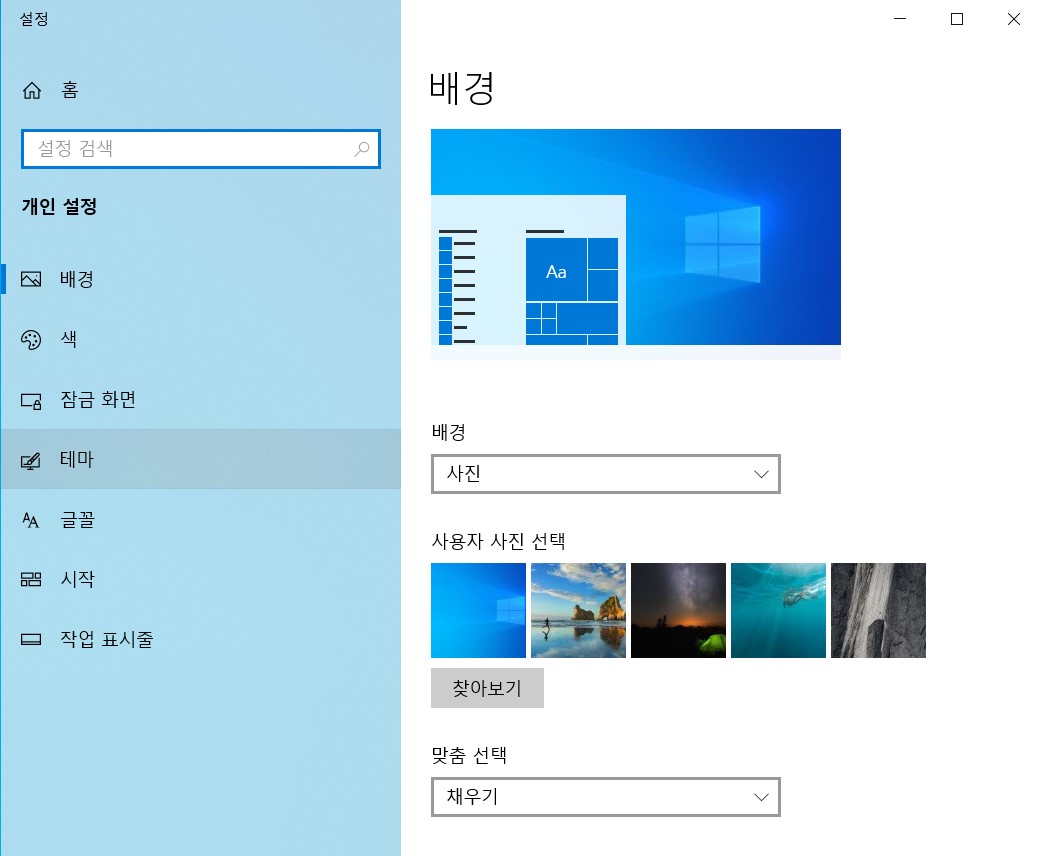 바탕 화면의 아무곳에서나 마우스의 "오른쪽 클릭"을 하여 메뉴를 표시합니다. 표시된 팝업 메뉴에서 "개인 설정"을 선택합니다.