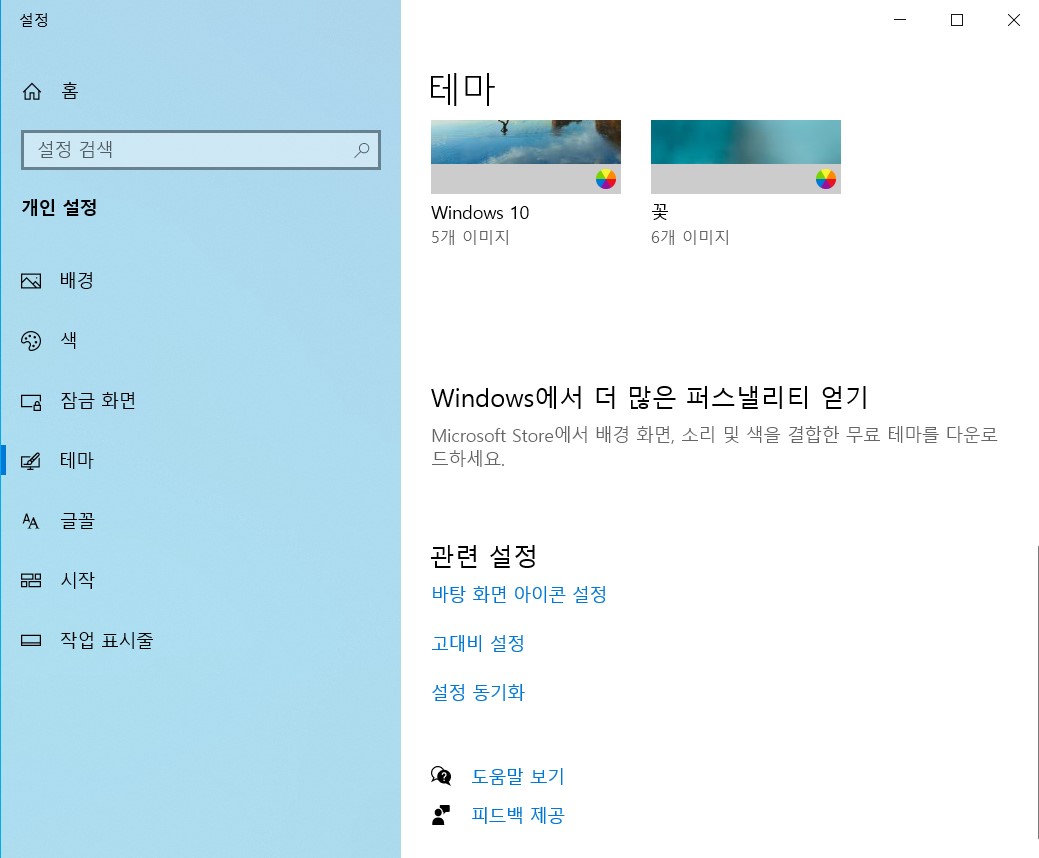 설정 창이 나타나면 왼쪽 메뉴에서 "테마"를 선택하고 "바탕 화면 아이콘 설정 '을 선택합니다.