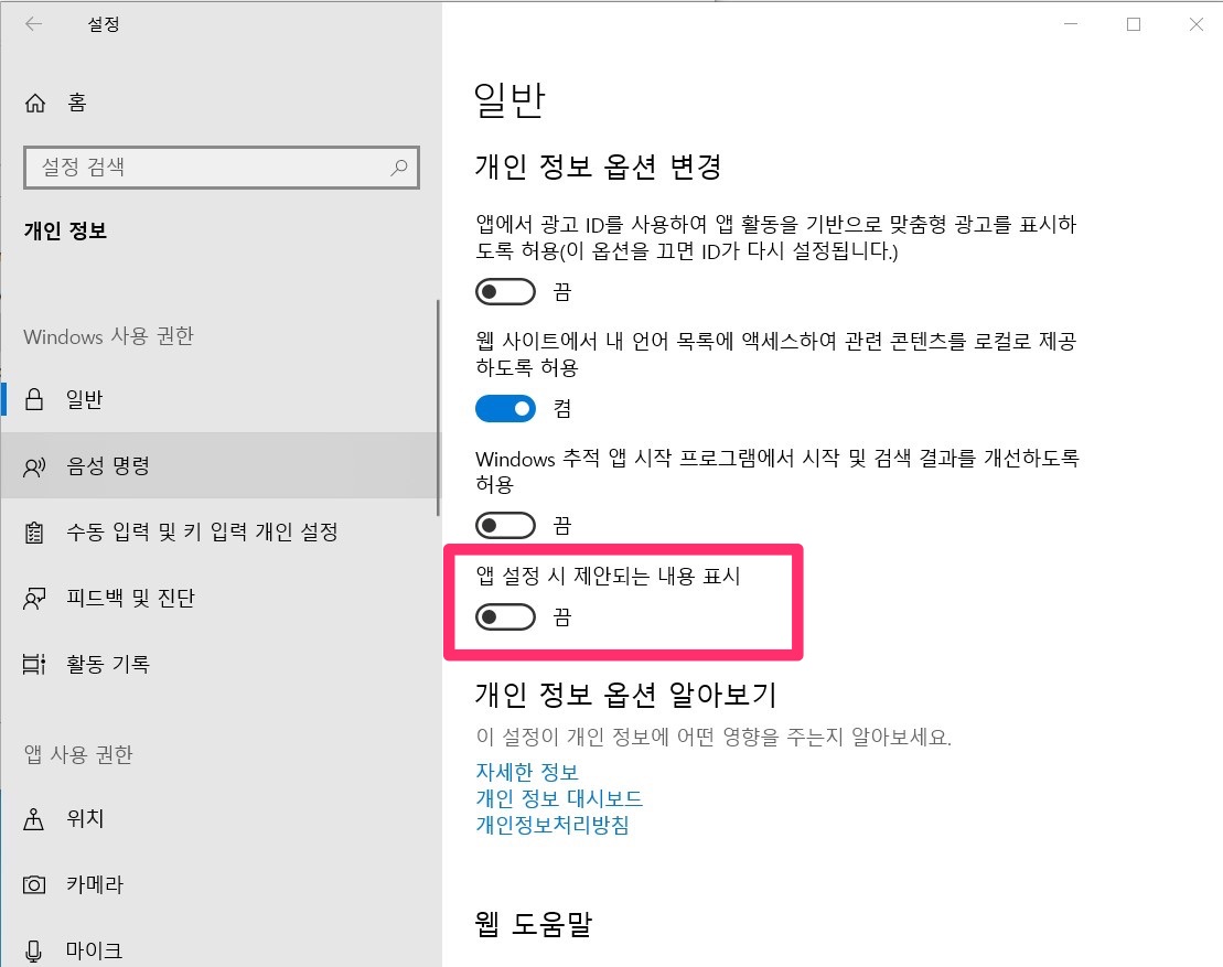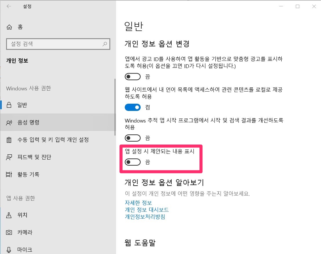 왼쪽 메뉴 "일반"탭을 선택하고, 오른쪽 내용의 '설정 앱에서 추천 콘텐츠 표시 "를"OFF "로합니다.