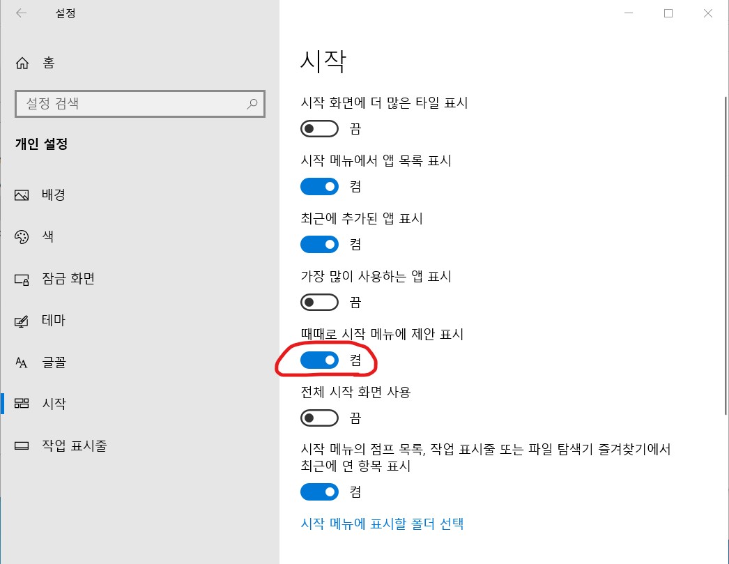 왼쪽 메뉴 "시작" 탭을 선택하고 마우스 오른쪽 내용 "때때로 시작 메뉴에 제안 표시" 를 "끔" 으로 합니다.