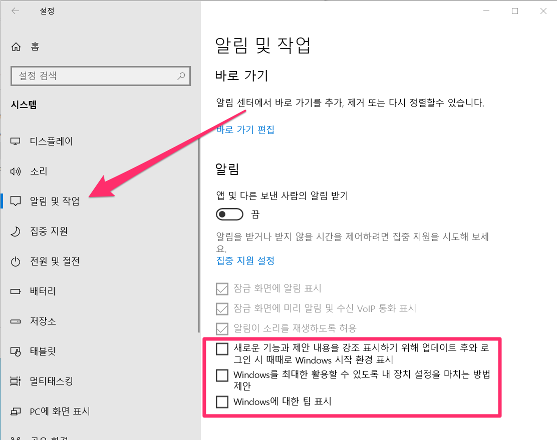 왼쪽 메뉴에서 "알림 및 작업" 탭을 선택합니다. 그리고 오른쪽 내용의 "새로운 기능과 제안 ..." 와 "Windows를 최대한 활용할 수 있도록..." 의 체크를 해제합니다. 그러면 이제 관리 센터에 홍보성 통보는 오지 않게 됩니다.