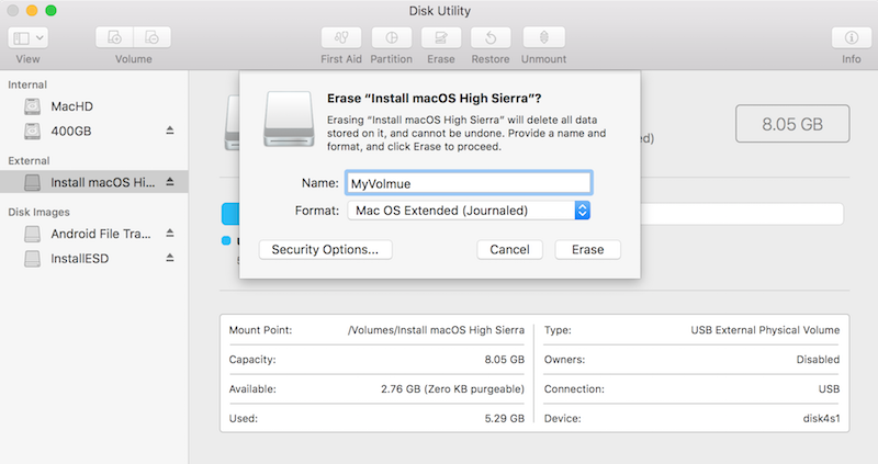 USB 를 준비합니다. 16gb이상을 추천하지만 8gb도 가능합니다. 디스크 유틸리티 앱을 이용하여, USB의 이름을 MyVolume으로 하고, 파일 형식을 확장저널링으로 포멧합니다.
