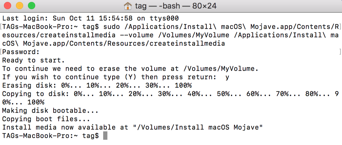 sudo /Applications/Install\ macOS\ Mojave.app/Contents/Resources/createinstallmedia --volume /Volumes/MyVolume /Applications/Install\ macOS\ Mojave.app/Contents/Resources/createinstallmedia