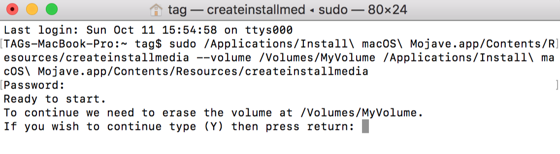 To continue we need to erase the volume at /Volumes/MyVolume. If you wish to continue type (Y) then press return: y