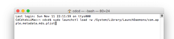 Spotlight를 다시 활성화해야하는 경우 터미널에 다음 명령 ( sudo launchctl load -w /System/Library/LaunchDaemons/com.apple.metadata.mds.plist )을 입력하고 리턴 키를 칩니다.