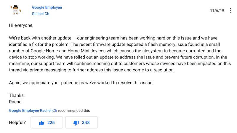 위 구글 서포트를 보면 구글의 펌웨어 업데이트에 문제가 있었던 것 같습니다. 그리고 아래 글로 보아 구글도 인지를 하고 있는 듯 합니다. 구글직원인 레이철에 따르면 플레쉬 메모리 문제가 소수의 구글홈 기기에서 발견됐다고 하네요.