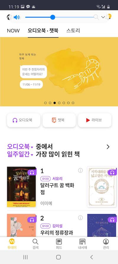 그럴때 책을 읽어주는 오디오북 어플을 사용하면 길을 걷다가도, 대중교통 안에서도, 심지어 자기 전 침대에 누워서도 어떤 상황에서든지 바로 책 속으로 몰입할 수 있게 해 줍니다.