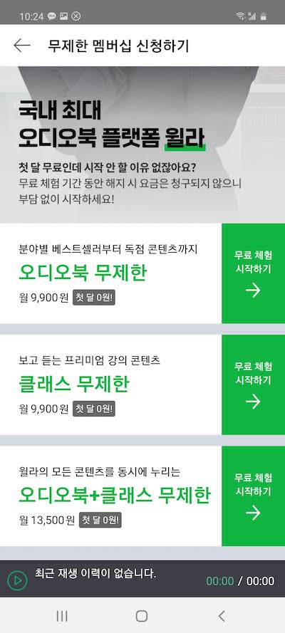 마지막으로 소개하는 어플은 윌라입니다. 윌라도 한달 무료기능을 제공하고 있어서, 서비스를 먼저 확인하고 가입을 결정할 수 있습니다.