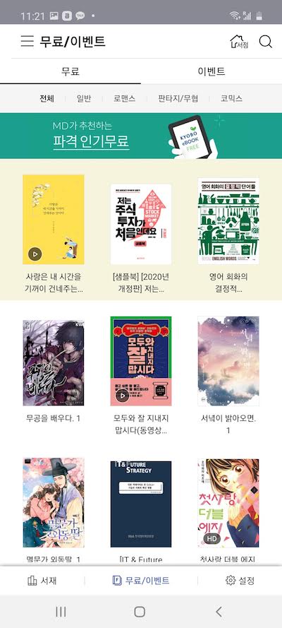 회원 가입을 하지 않아도 무료/이벤트 책들을 읽어볼 수 있다는 것은 큰 장점인것 같습니다. 여러 ebook들을 구매를 하고 받아서 서재에 저장을 해둘 수가 있습니다. 서재의 기본책장에서 저장해 놓은 책들을 읽어볼 수 있구요. 저장해 둔 책들은 인터넷이 안되는 환경에서도 사용가능합니다.