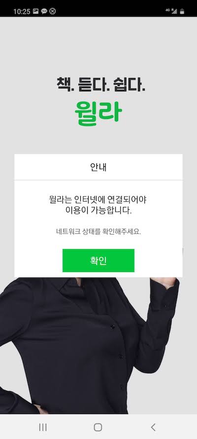 한가지 안타깝게도 윌라의 경우는 인터넷이 안되면 사용할 수 없습니다. 꼭 인터넷을 연결해서 사용을 해야 합니다. 아무래도 인터넷을 기반으로한 오디오 읽는 기능이 강화됐기 때문인것 같습니다.
