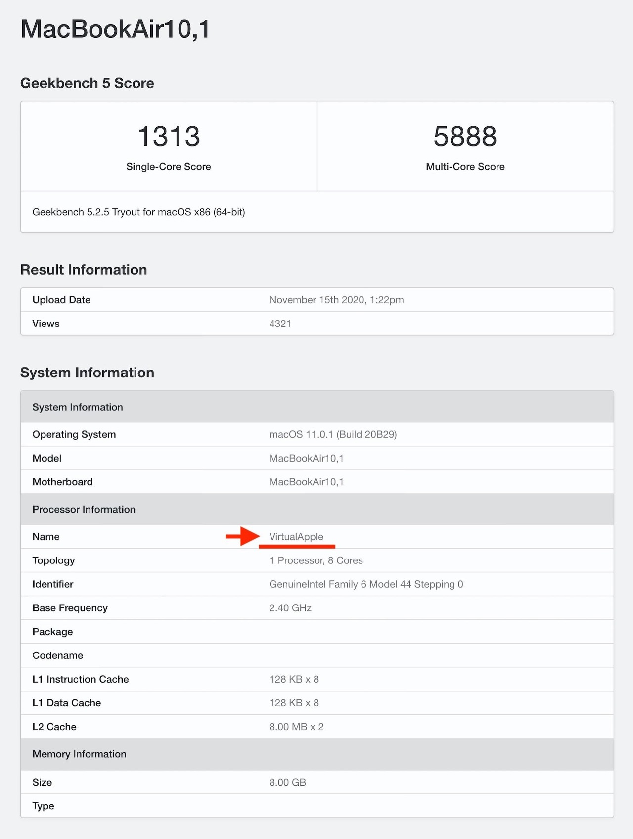 로제타하의 싱글 코어 스코어는 "1313", 멀티 코어 스코어는 "5888" 인 반면, Intel의 칩을 탑재 한 MacBook Air (2020)의 싱글 코어 점수는 "1138"멀티 코어 점수는 "3072"인데요.