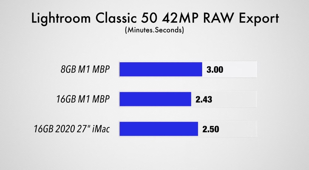 Xcode의 벤치 마크 측정은 16GB 모델이 122 초에서 빌드를 컴파일했지만, 8GB 모델은 14 초 늦게 완료. Lightroom Classic에서는 편집시 성능 차이는 없었지만, 4,200 만 화소 RAW 파일 50 장을 내보내기는 불과 17 초 차이. 또한 16GB 모델은 27 인치 iMac (2020)의 16GB 모델보다 빨리 완료하고 있습니다.