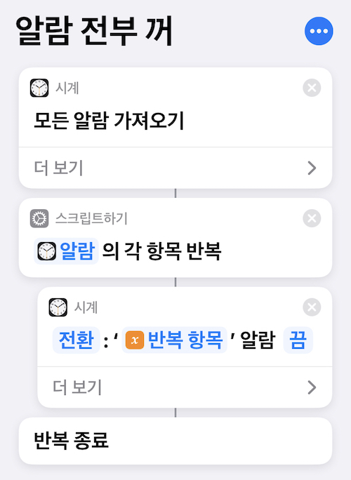 그래서 알람을 한꺼번에 끄는 단축어도 만들었습니다. 단축어 자체는 매우 심플해서 아래와 같습니다.