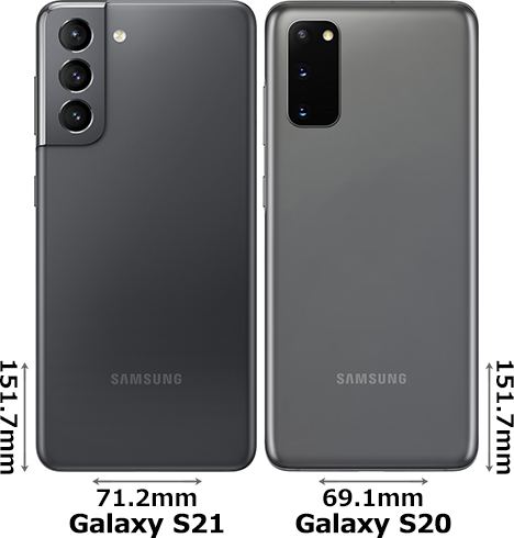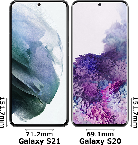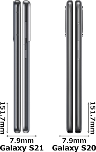 디스플레이 경우 "갤럭시 S20" 는 양쪽이 곡선 "듀얼 엣지 스크린" 이었지만, "갤럭시 S21" 은 평면스크린으로 변경되었습니다. 이에 따라 "갤럭시 S21" 은 베젤 폭이 조금 넓어지고 본체의 폭이 2.2mm 증가하고 있습니다.